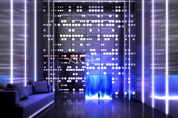 廣東肇慶 V-MAX 維密斯電音派對酒吧外觀設計十足耀眼,在夜晚就如同一座不夜城,想必經過的人都能想象到里面的人玩的有多享受。上下兩部分采用橫條和豎條的燈光在視覺上起到分割的作用。上半部分采用較暗的藍紫色作為燈光底色,襯托正中間一塊巨大的梯形LED屏,LED的色彩明亮,畫面質感都彰顯了酒吧的動感十足,讓每一個經過的人都能感受這一份無法抵抗的熱情。下半部分采用明亮漸變的豎條紋,錯落的燈光就如五彩斑斕滾動的彩虹。入口兩側星星點點的燈光密集地分布,星光璀璨,格外耀眼,似乎每一顆星星都在眨巴著眼睛說“讓我們盡情享受這激情之夜吧”。