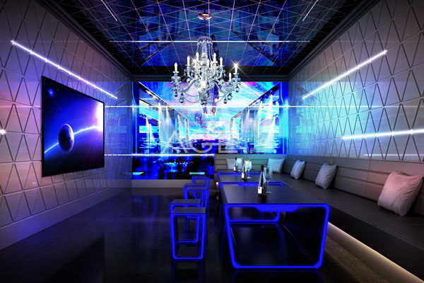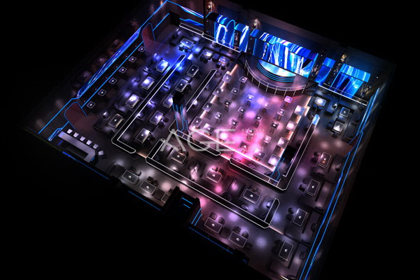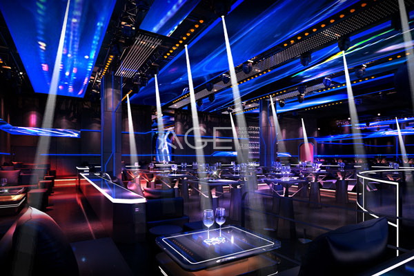 整個酒吧格局方正,從內到位的區域劃分由中心舞臺以正方形的形狀向外擴充,整齊規范,燈光也由中心明亮多彩漸漸轉弱,給人從激情到放松的絕佳體驗。酒吧的內部空間是設計師打造的重點區域。前廳區域,一盞盞穿透力極強的小射燈準確無誤地投影在對應的位置上,讓每一位客人都有屬于自己的主角光環。頂部采用大片流動性的藍色燈區,四周的藍色線條燈帶與之呼應,瞬息萬變的燈光可以從一個安靜的少女變成魅力四射的狂野女郎,四面八方投射出五光十色的光影,氣氛燃爆全場。每張桌子用明亮的線條勾勒出本身的形狀,貼心的設計是為了讓每一位客人都能輕松找到自己的專屬座位。