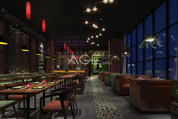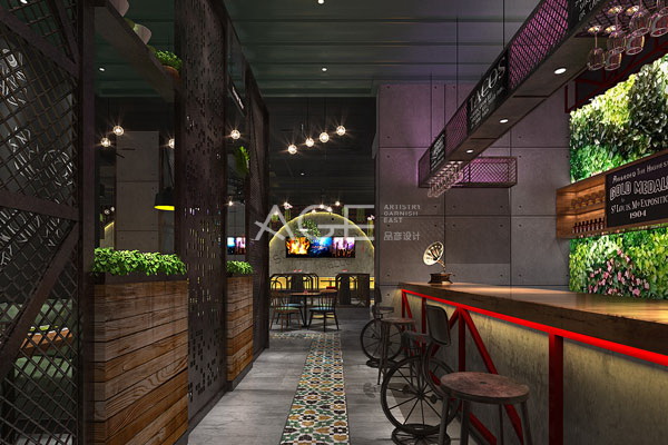 F2餐飲酒吧設計色彩搭配著實讓人眼前一亮,餐廳內部設計十分現代,寬敞空間以現代材料與明亮色彩打造出典型的工業風室內裝飾風格。墻面裝飾性的圖案頗具藝術感,與各式家具一同組合成一幅既現代又不乏生氣與創意的生活圖景。