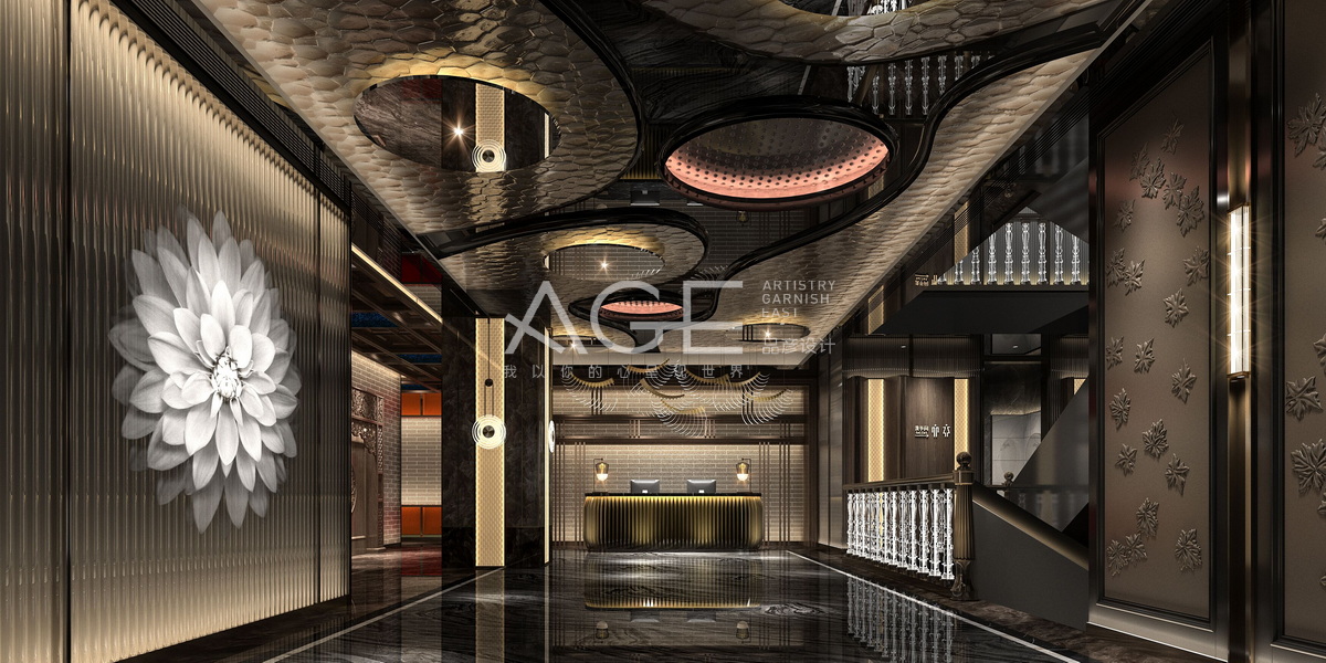 商務KTV一樓大堂,新中式風格的設計,突顯出典雅高貴的東方式意境,圖案和花色、光影增強空間立體感,古典與現代的碰撞,鏤空雕花元素更顯得沉穩大氣的色彩,再加上室內陳設的搭配,烘托出室內較高的文化底蘊。