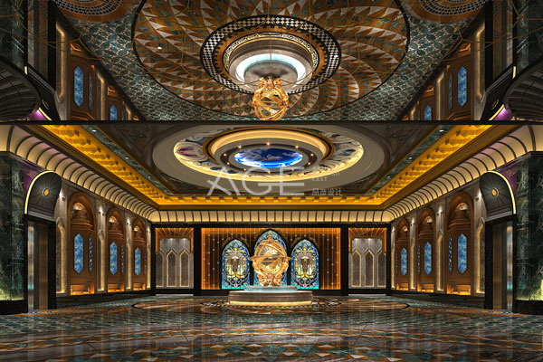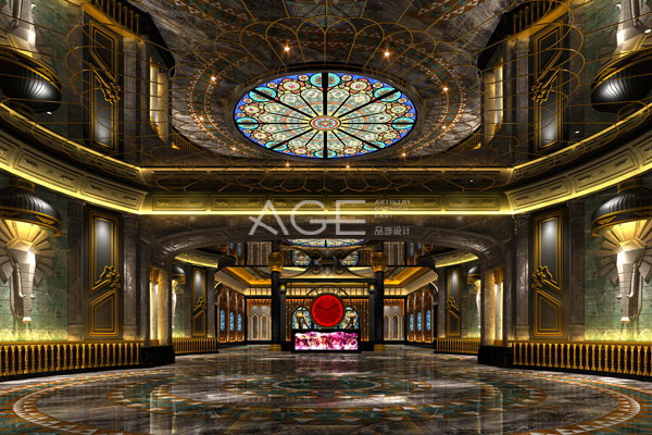 進入大堂空間,重點突出了別致典雅的設計特點,撲面而來的優雅氣質,美的讓人窒息。吊頂采用分層、分區設計,中心設置的圓形、環形區域,將彩繪玻璃的元素運用到極致,四周環繞鏡面材料,中心位置配以幾何圖形彩繪燈具,仿若王冠上巨大的寶石,耀眼奪目。地面采用不同色度的大理石板材,明暗結合組砌出幾何圖案,與吊頂造型交相輝映,營造出和諧統一的設計美感。