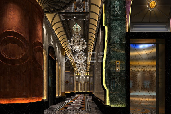 走廊空間楊彥設計師充分利用空間的優勢,吊頂成為整個空間的亮點,大氣奢華的水晶燈仿若顆顆鑲嵌在墻壁上的鉆石,增添空間的神秘感,于細節上凸顯尊貴氣質,精致而有品位。地面采用幾何圖案點綴,讓整個空間充滿節奏感,并利用色彩明暗形成立體效果。電梯門以金屬隔條勾勒出出花瓣造型,暗襯的燈帶營造出輕奢氛圍。