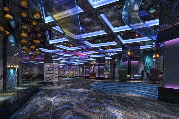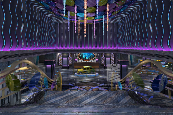 進入本案的大廳空間,消費者能撲面而來的感覺到震撼,華麗夢幻的設計奪人眼球。大廳的裝修設計中,利用磅礴大氣的躍層樓梯設計,讓大廳的整體設計充滿了層次感。樓梯的扶手沒有采用常規的形式,而是運用流線型的曲線設計,用金屬材質勾勒出別致的造型,如翻騰起的朵朵浪花,金屬扶手上嵌入的燈具也似一片片貝殼點綴其中,波瀾壯闊中別有韻味,讓人瞬間拋開當下工作生活的煩惱,開啟快樂時光。大廳的吊頂設計也十分巧妙,選用了典雅的水晶吊燈,燈光閃爍間仿若一塊塊晶瑩剔透的寶石,搭配亮麗的色塊組合,整個吊頂像一只色彩斑斕的熱氣球,營造出超炫彩的震撼效果。側邊墻壁運用了大量的波浪造型,并將LED燈帶嵌入其中,充分發揮隔音效果功能性的同時,與樓梯、吊頂和墻壁設計交相輝映,仿若進入愛麗絲的仙境,如夢如幻。