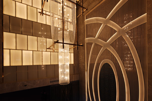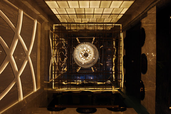 為達到空間分割的藝術性,滿足功能分區的需要,設計中采用了大量的鏤空屏風元素,拱形、扇形、矩形等多種形式也和吊頂設計相得益彰,既保證了空間的通透性,也凸顯出典雅別致的特點,表達傳統元素的同時,讓空間更為靈活多變。走廊空間也是充滿設計感,兩側的墻壁選用傳統窗棱設計,選用鏡面馬賽克板材作為底襯,通過不同形狀的排列組合,與吊頂設計和諧而統一,增加空間的層次感,暗埋的燈光設計,更是將層次感提升到極致,散發出神秘色彩,凸顯出設計質感。