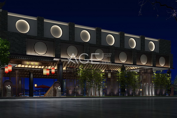 本案作為民宿設計,周邊環境優美僻靜,設計師秉承“因借環境、融為一體”的理念,以中式園林的思路精心打造,臨水而建,依木而起,目光所及之處都是令人心曠神怡的風景,這也成為本案空間設計中最大的亮點。民宿的外觀設計,以廣東中山地區最常見的建筑風格為主,融入嶺南建筑中的“鑊耳屋”、“天井”、“碉樓”、“騎樓”等建筑元素,外墻壁以典型的清水墻作為裝飾,以突出墻面的立柱進行分割,青磚為基礎,白色石灰勾縫,并設置多個圓形圖案,內置氛圍燈帶,整個外觀古樸素雅,別具韻味。