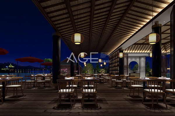 外拓平臺空間充分發揮視野開闊、景色優美的優勢,主要作為休閑區和就餐區。吊頂設計與室內大堂一脈相承,利用排列組合的變化形成自己的特色,吊燈選擇簡約的網格燈,整齊排列的餐桌椅,紅色遮陽傘,柔和的燈光點綴,簡單不單調,幽靜而舒適。