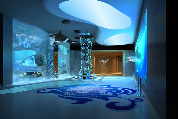 設計說明:本案是以海洋生物為元素的具有主題科普性的大型展示展覽館。整體空間采用充滿夢幻和清新的海洋主題色,藍色。將海洋生物類的實物和模型合理配合展示,多數位置采用3D 效果展示,館內配合相應的背景音樂,使得參觀者更加身臨其境!