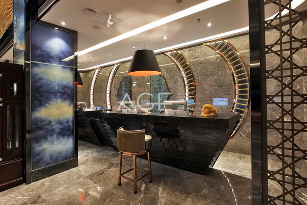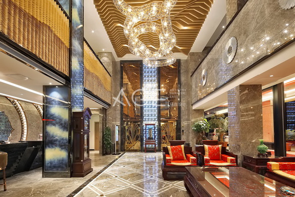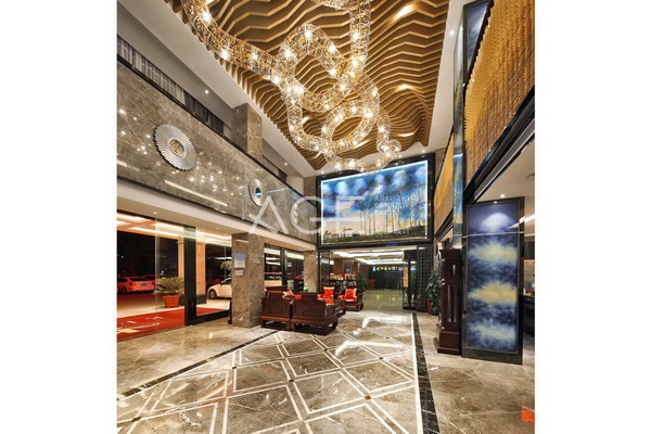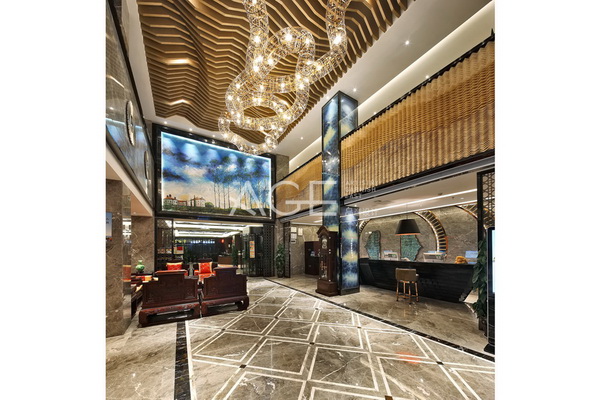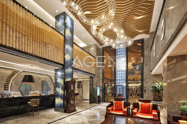 商務酒店設計主打高端精品路線,各功能空間規劃合理,設施齊全,酒店大堂、餐廳、客房、高標準會議室等在功能設置及裝修設計上可謂各具特色。酒店大堂充分利用層高優勢,打造出奪人眼球的震撼效果,前臺設計中借鑒昆明地區代表性的古滇青銅文化元素進行背景墻裝飾,對稱的鎖盤及弧線造型仿若跳躍的琴弦,彈奏出彩云之南的別樣風情。