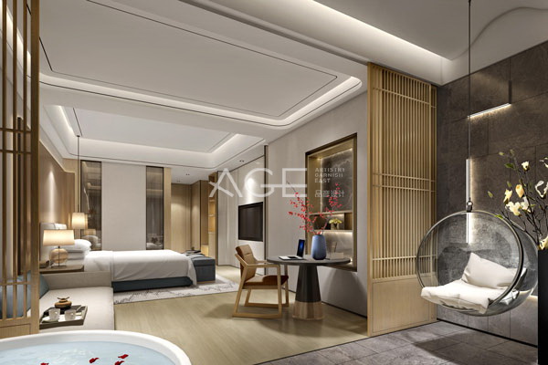 二十樓層的電梯能夠讓你直達大庭的中部,本案中大堂巧妙的運用了燈光與傳統的木材相互襯托,晶瑩剔透之中還有一種木材的厚實感,傳統與現代的相輝映,讓整體呈現出一種輕奢感。沿著走廊,閑庭信步之間,移步換景,能夠看到櫻花樹與靜如平面的水池,讓人感覺到宛如落入仙境。值得一提的是本案中保留了福州當地的茶文化,福州人喜茶,從南宋詩人陸游的詩中可見端倪,如“福州正月把離杯,已見酴醾壓架開”,本案的茶室別具一格地融入了當地茶文化,采用古典茶室原型還原,極佳的品茶環境、精美的茶具茶道為貴賓們打造了一幅福州人忙里偷閑、品一杯茶的畫面,在福州東百坊巷酒店的茶室里就可偷得浮生半日閑。