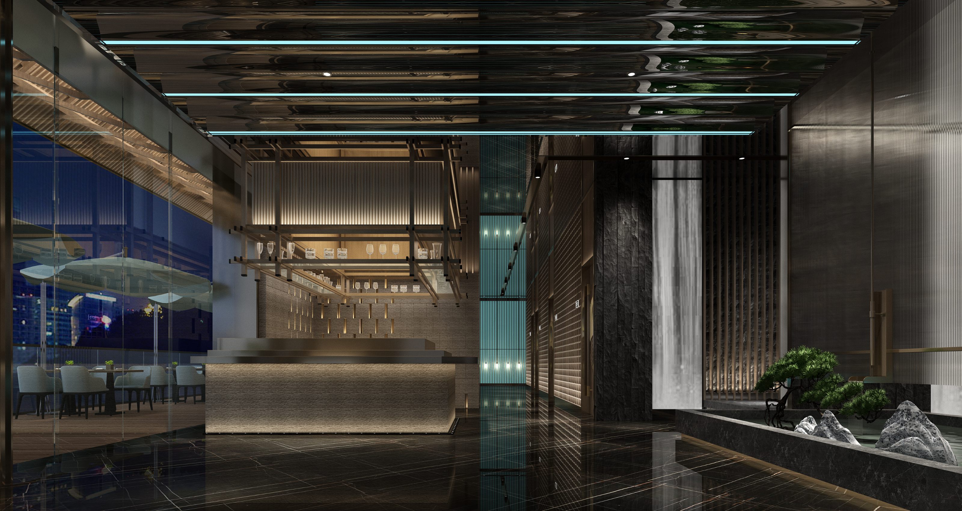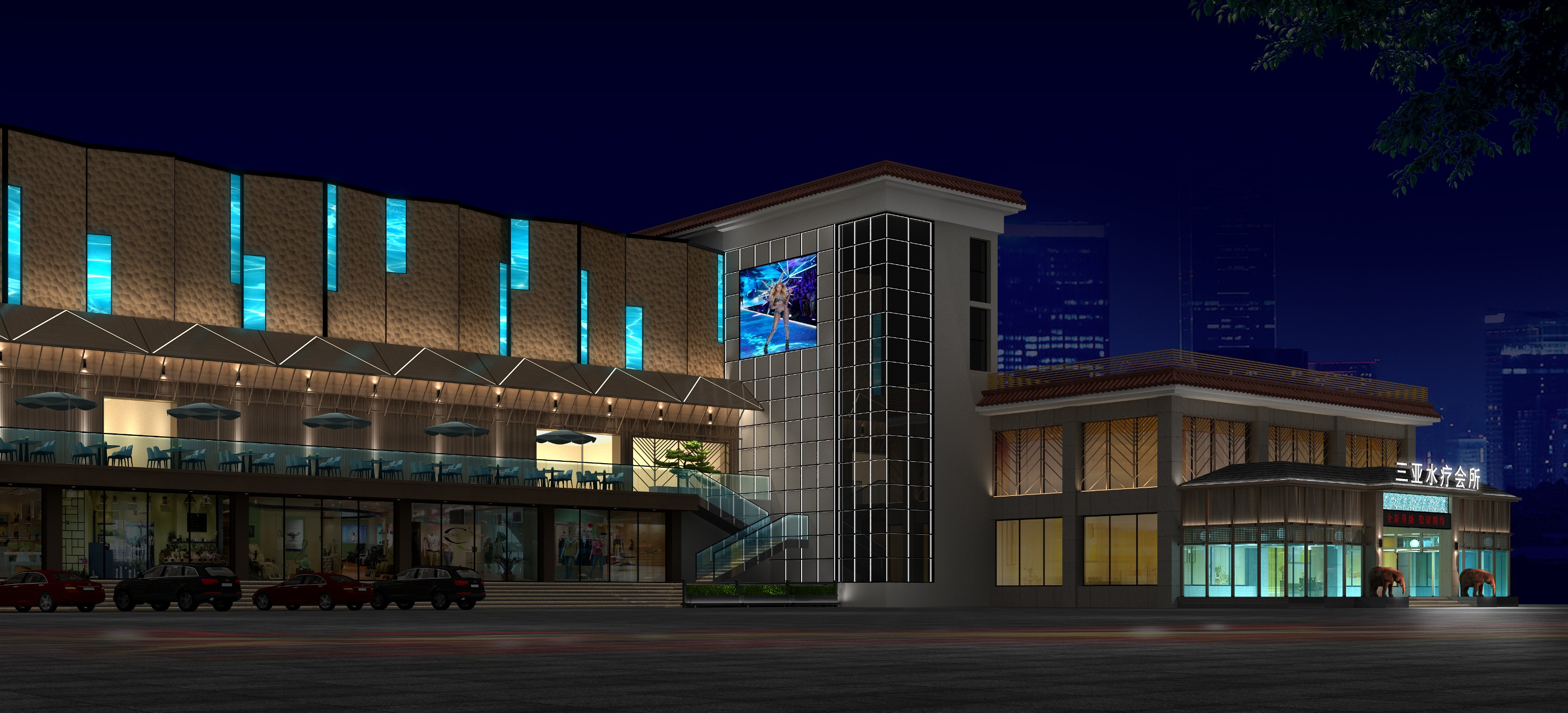 水療會所外立面整體設計,設計師采用大面積規整類木色建材和傳統窗欞設計營造中式宮殿氛圍,體現水療會所高端莊重。氤氳著清澈柔和藍光的水紋燈牌在貼合水療主題的前提下,給予消費者一抹寧靜淡雅之感。一樓大堂區域外圍隔斷采用多面落地玻璃,用輕柔藍光映照出水療會所的部分內部裝修設計,以猶抱琵琶半遮面的朦朧美感吸引消費者關注。