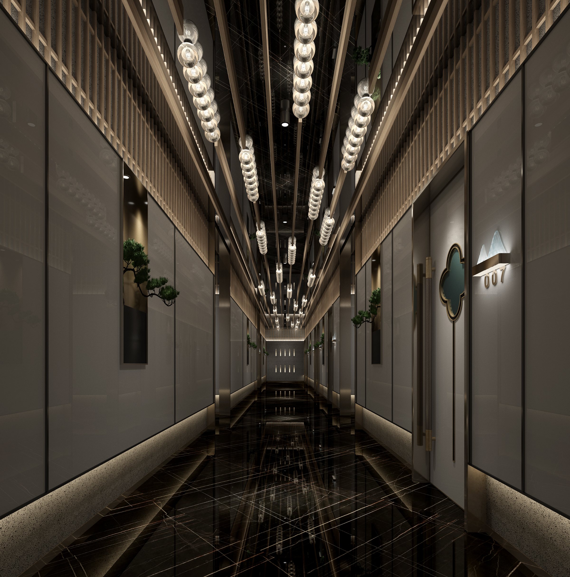 走道設計依舊延續中式淡雅的高貴之氣,大開大合的簡約設計排布自有中式建筑的大氣典雅,兩側墻面放置的蒼綠勁松盆栽打破了平面空間限制,為整條走道的設計增添了幾分活力與亮色。走道吊頂設計,設計師以算盤為設計理念,讓算珠燈光在錯落排序間一如跨越時間空間的璀璨流光,鏈接古今時空。
