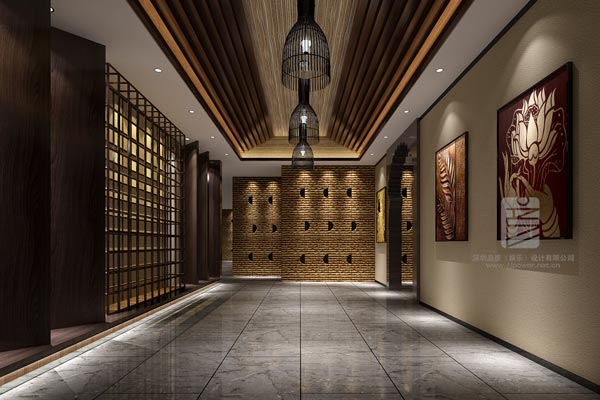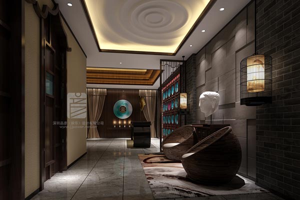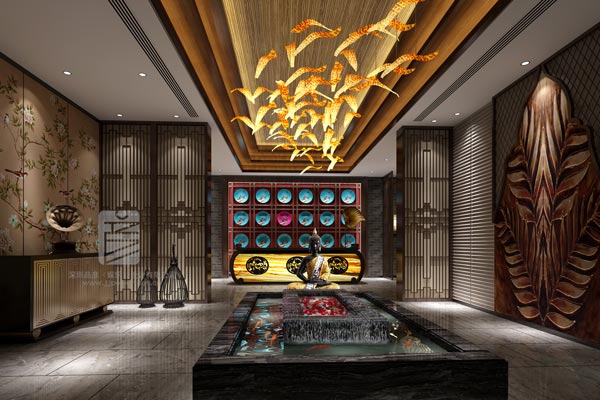 LED與亞克力相結合的新科技方式形成雨簾,中間橢圓形嵌入佛手。左方擺設留聲機,右側打造水景,中間接待臺由黃色透光石打造,后方采用藍色陶瓷盤,其中用一個桃紅色盤點綴。整體簡約與泰式相結合,靈動且精致。